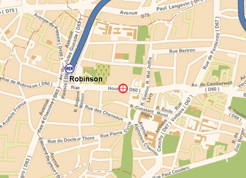 - RER B, tuyến Plessis Robinson (đừng lấy tuyến đi Antony, St Rémy les Chevreuses)